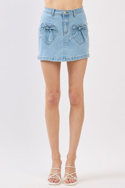 Introducing the Heartbeat Skirt - a must-have addition to your wardrobe! Made with stretch denim, this skirt offers both comfort and style. Its side ribbon bow adds a playful touch to this mini skirt, making it a versatile piece for any occasion. Elevate your fashion game with this statement piece.