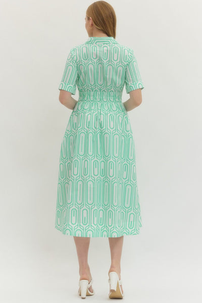 Entro Geometric Print Shirt Dress, a signature style from the Los Angeles-based contemporary brand known for its versatile and feminine designs. This dress features a unique geometric circle pattern in a vibrant mint and ivory palette, offering a modern twist on the classic shirtdress.
