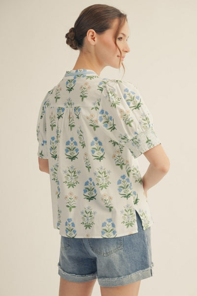 Design & Silhouette: This top features an eye-catching block floral print in shades of blue and gold against a crisp ivory background. It is designed with a flattering split V-neckline, a stand-up ruffle collar, and tiered puff sleeves finished with comfortable smocked cuffs.