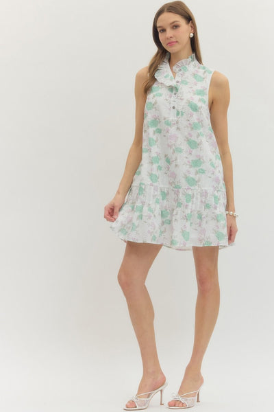 This vibrant Entro sleeveless dress is a signature boutique piece that blends effortless spring and summer style with refined, architectural details. It features a lush green and white botanical print that offers a "refreshed" and feminine look for the season.