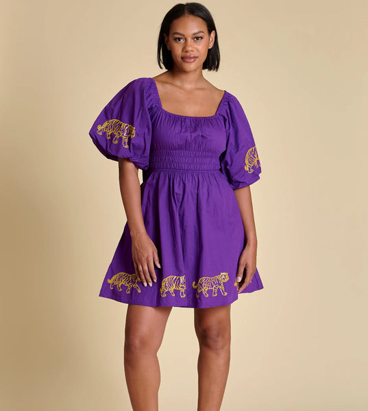 "Unleash your inner tiger with The Puff Sleeve Dress LSU. The playful puff sleeves feature a fierce tiger on the trimming, perfect for showing off your team spirit. Let this dress be your go-to for game days and beyond (roar)!"
