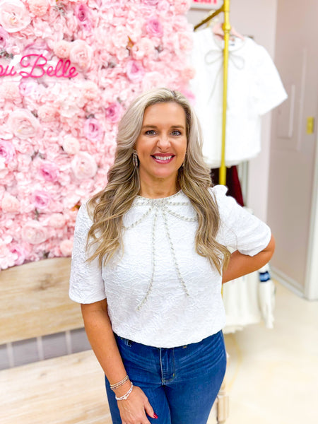 Introducing the Everybody Bows Top - the perfect blend of elegance and charm. Made with a rhinestone bow shape floral jacquard fabric, this top is sure to make a statement. Enjoy the benefits of high-quality material and intricate design. Elevate any look with this must-have piece.