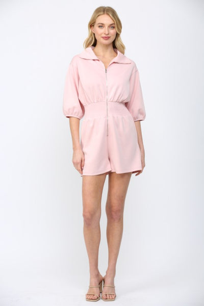 Defined by its polished "scuba" or "off-duty" style, this romper features a structured collared neckline and a functional front-zip closure. The design is meticulously balanced with voluminous puff sleeves and a deeply smocked waistline, creating a flattering, architectural silhouette that is a hallmark of high-end contemporary fashion.