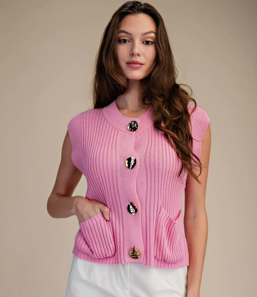 The Chic Closure Vest Top features a sophisticated button detail, enhancing both style and functionality. This knit vest provides added warmth and layering versatility, making it suitable for various settings. Crafted from durable materials, it is designed to withstand regular use while maintaining its shape.