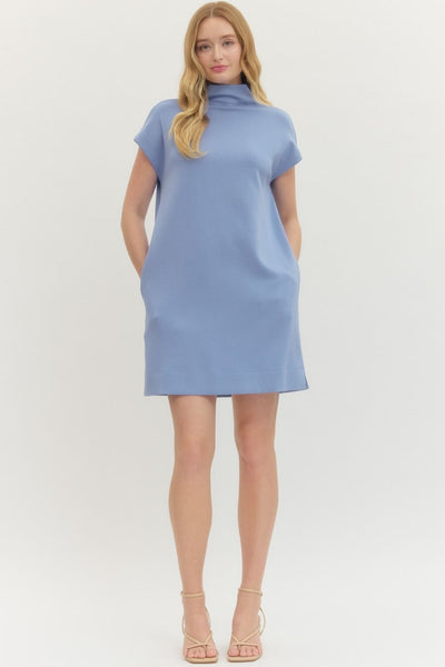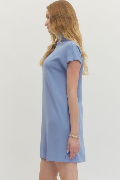 This light blue high-neck shift dress offers a refined yet effortless silhouette, perfect for both casual elegance and understated sophistication. Its clean lines and minimalistic design make it a versatile wardrobe staple that transitions seamlessly from day to evening.