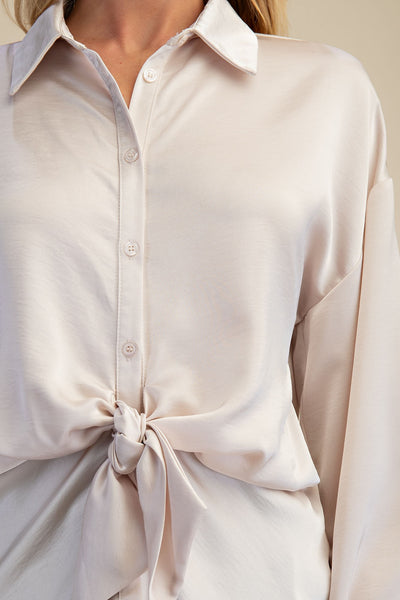Luminous texture meets a relaxed, modern silhouette in this versatile satin shirt top. Designed with a playful front-tie detail and a high-shine finish, this piece effortlessly elevates everyday wardrobing with a touch of understated glamour.