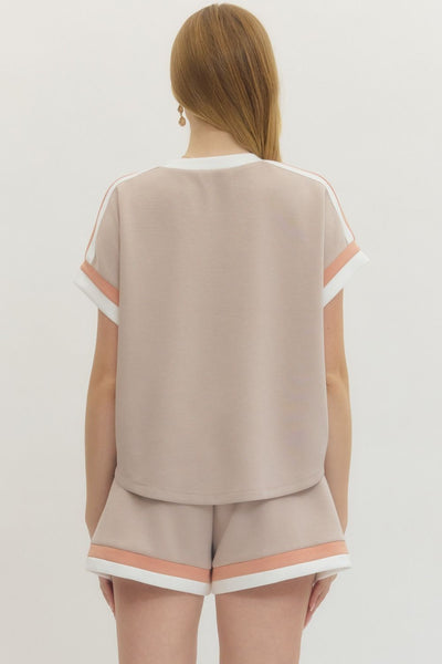 Design Details: This matching set features a solid short-sleeve knit top and elastic waist shorts, both accented with vibrant contrast trim. The top includes trim at the neckline, sleeves, and shoulders, while the shorts feature a matching contrast hem and a functional drawstring waist.