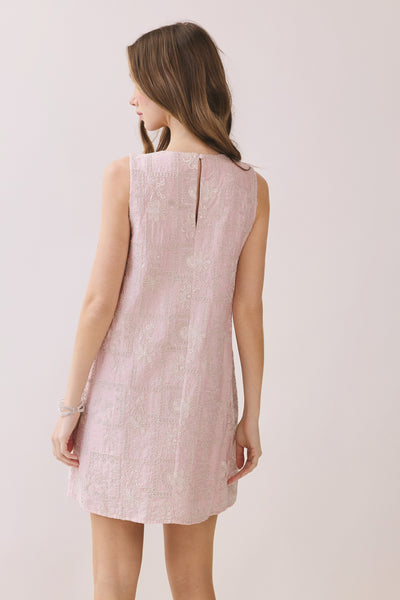 Sleeveless Mini Dress featuring an all over embroidered patchwork design