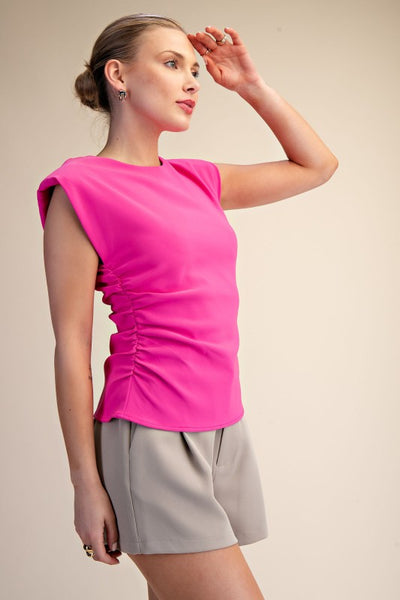 This sleeveless top features a refined crew neck and architectural cap sleeves with shoulder pad inserts, creating a sharp, "power-dressing" silhouette. The bodice is designed with side-ruched detailing that cinches at the natural waist, offering a flattering, tapered fit that balances the volume of the shoulders.