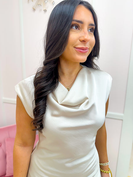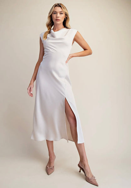 The Modern Romance Slip Dress in cream features a short sleeve design with a cowl neck, offering a sophisticated silhouette suitable for various occasions. Its midi length enhances versatility, allowing for easy pairing with different footwear. Crafted for comfort, this dress combines elegance with practicality.