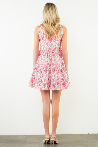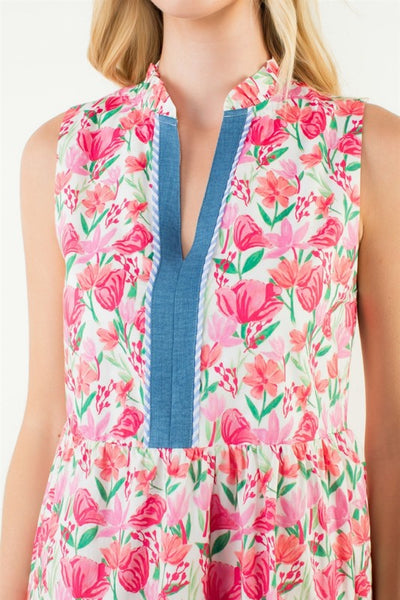 - Sleeveless design for effortless movement and breathability - Floral details that celebrate vibrant, blooming moments - Contrast neckline adds a touch of elegance - Convenient pockets for practicality without sacrificing style
