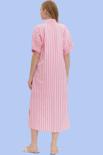 This pink and white vertically striped maxi dress offers a breezy, effortless elegance perfect for warm-weather days. Its relaxed silhouette and lightweight fabric make it a versatile piece that transitions seamlessly from casual daytime wear to chic resort evenings.