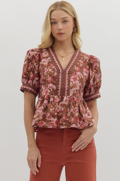 Floral print V-neck ruffle hem top featuring scallop trim accent contrast band detail. Unlined. Woven. Non-sheer. Lightweight