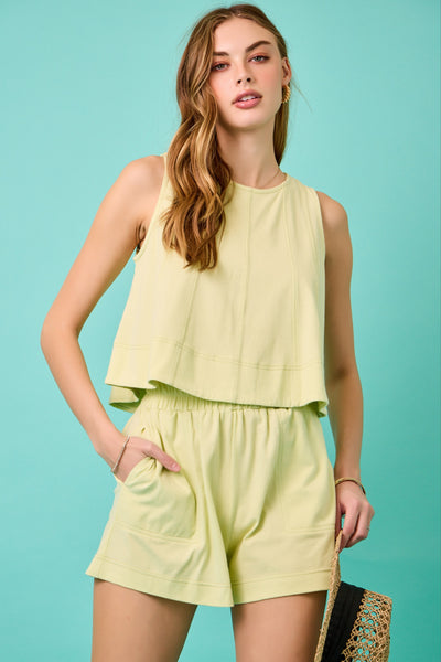 Unleash your inner chill with the Sweet Pea Set! This sleeveless top boasts a contrast line stitch that says, “I woke up like this” (but, like, in the best way). Paired with lime cream lounge shorts, it’s perfect for lounging or spontaneous dance-offs in your living room!
