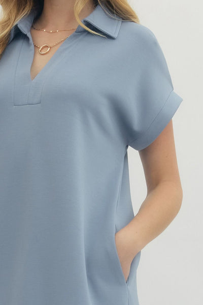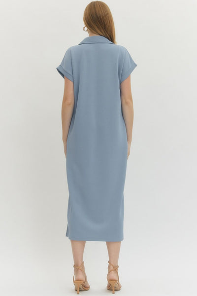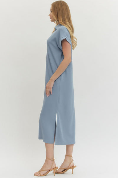 • Design Detail: A short-sleeve, solid knit pullover midi dress featuring a classic split collar for a structured yet easygoing aesthetic.