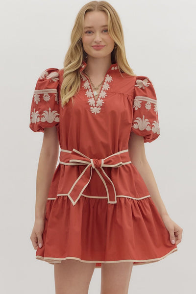 Solid contrast accent self belt pullover mini dress featuring embroidery along split neckline and short bubble sleeves. Side pockets. Lined. Woven. Non-sheer. Lightweight.